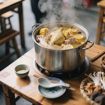 中式暖锅,金属质感锅具盛装热气腾腾的羊骨汤,搭配油润汤汁与液态光影,辅以葱花、辣椒、蒜瓣点缀,实景感十足,传递质朴温馨的冬日食光。