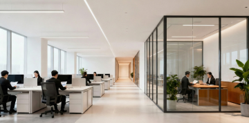 俯瞰视角,极简主义风格客厅以深邃的墨黑与温润的原木色为基调,倾斜45度的构图展现出几何切割般的空间层次感。清晨的冷蓝色光线从整面无框玻璃墙斜射而入,在深灰色微水泥地面上投下窗格的几何阴影,窗外是被薄雾笼罩的城市天际线剪影。中央悬浮着一个由黑色金属框架与烟熏玻璃台面构成的不规则多边形茶几,周围环绕着三张浅灰色模块式布艺单人沙发,每个沙发配有一个芥末黄皮质靠垫。右侧墙面是整面的胡桃木饰面板,内嵌线性LED灯带勾勒出隐藏式储物空间的轮廓。天花板采用悬浮式设计,中央垂挂着一个由12个不规则玻璃球体组成的艺术吊灯,在地面投射出破碎的光斑图案。空间角落摆放着一株大型琴叶榕,其深绿色叶片与整体冷色调形成鲜明对比。地面铺设着一块巨大的米白色羊毛手工编织地毯,边缘处有渐变的黑色几何图案。整体氛围呈现出一种冷静的奢华感,光线在不同材质间的反射创造出丰富的视觉层次,既保留了原空间的通透感,又通过色彩与光影的转变赋予其北欧极简的清冷美学。
