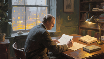 构图:狭小、脏乱的房间,一张简陋的床,一张摇摇晃晃的桌子,墙上钉满画作 色彩:暗黄色调,光线从唯一的小窗户斜射进来,灰尘在光束中飞舞 细节:斯特里克兰德背对画面,专注地在画布上涂抹,画布上是抽象而充满张力的色彩