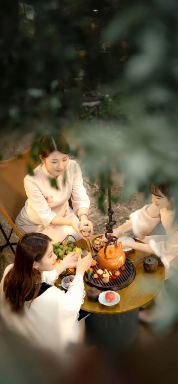 傍晚户外露营场景,白色帐篷下人们围坐在餐桌旁聚餐,帐篷顶部和四周悬挂着温暖的串灯,周围点缀着点燃的蜡烛和灯笼,营造出温馨浪漫的氛围,绿色草坪上散落着舒适的坐垫和靠枕,树木的枝叶在灯光下形成柔和的阴影,整体色调温暖,光影层次丰富,充满自然惬意的露营生活气息。
