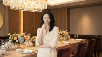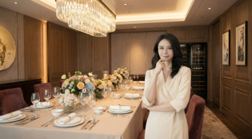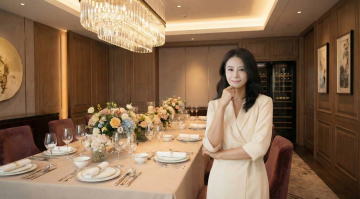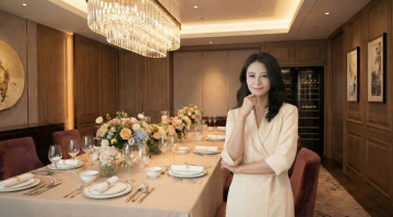 夜幕下的邮轮甲板,女性身着黑色晚礼服手持红酒,都市天际线与水面倒影交织,光影流动间尽显奢华浪漫与现代都市的优雅格调。