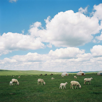 真实照片,辽阔的草原风光,画面中央偏后位置有一座白色的蒙古包,蒙古包周围散落着几只牛羊,前景是一大群正在低头吃草的羊和牛,毛色有白色和棕色,绿色的草原一望无际,远处是起伏的绿色丘陵,丘陵上有一棵孤零零的树,天空湛蓝,飘着几朵白色的云彩,阳光明媚,光线柔和,营造出宁静、自然、开阔的氛围,色彩鲜艳,细节清晰,具有强烈的空间感和层次感。