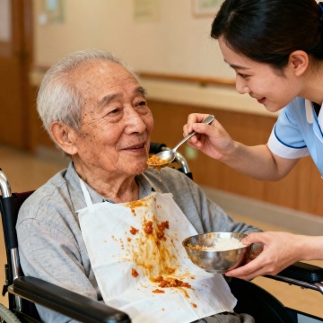 温馨治愈系插画,康养中心食堂墙绘。画面中央是一张原木餐桌,桌上有冒着热气的鸡汤、清蒸鱼、时令蔬菜,食物色彩柔和自然。一位面带微笑的女护理员正为一位慈祥的老奶奶盛汤,奶奶笑容满足。背景是温暖的米黄色墙壁,窗台有绿植。整体光线柔和温暖,光影斑驳,营造出安静、安心、如家庭聚餐般的温馨氛围。人物表情生动自然,笔触细腻。色调以暖米色、原木色、食物本色为主,点缀柔蓝色 红色和绿意。
