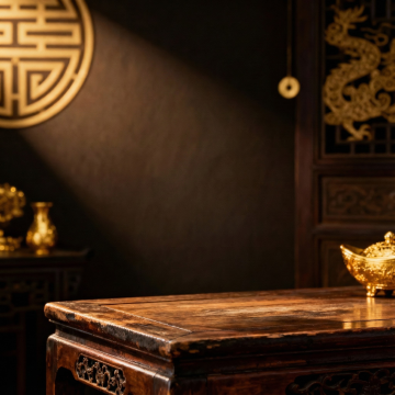 一张木纹桌面上,右侧放置着一个黑色镂空雕花屏风,屏风后有一盆绿色盆景,背景是柔和的暖黄色调,光线从左上角斜射过来,在粗糙质感的墙面上投下斑驳的光影,营造出宁静而古朴的氛围,环境变换为传统中式书房的角落,光线柔和温馨,整体风格统一且具有古典韵味。