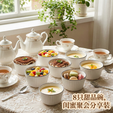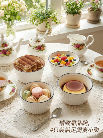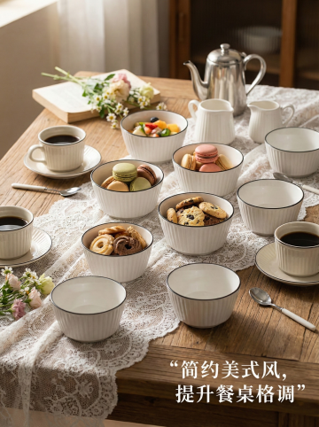 这是一只陶瓷碗,其名称为山田竖纹美式碗,碗口直径为4.5英寸。我给你提供了一张白底图,请根据我的白底图,帮我绘制6张不同角度的场景图。每张场景图比例为1:1,内容是将这只碗与不同的日常生活场景结合,并配上简要的卖点介绍。特别注意生成的场景图中,必须包括10个这样的碗,每个碗的造型、颜色或者样式都不能改变,必须和我提供的图片中的碗一样。碗的大小、摆放角度、位置可以根据场景的不同进行调整。