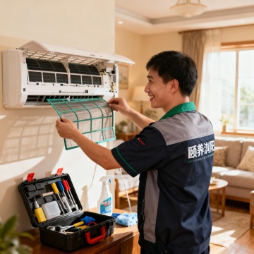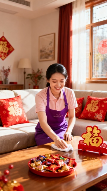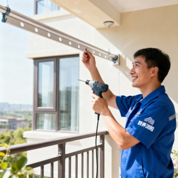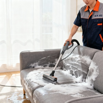 帮我生成带“颐养浏阳”服务人员窗帘清洗服务场景的图片