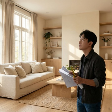 极简主义风格的现代客厅背景,整体以米白色、原木色和浅灰色为主色调,柔和的自然光从左侧大窗户斜射入室内,在墙面和地板上形成清晰而温暖的光影效果,光线明亮且均匀,营造出宁静、舒适、通透的氛围。画面中央是一张米白色布艺三人沙发,搭配同色系的靠垫,沙发腿部为浅色木质,沙发上随意搭着一条浅色毯子。沙发前方是一张浅木色长方形茶几,茶几上摆放着简约的白色陶瓷花瓶和几本书籍。沙发左侧靠近窗户处有一盆茂盛的绿色植物,栽种在白色高花盆中。沙发右侧是一个浅色木质书架,书架上摆放着少量书籍、装饰品和一个装饰画框。地面铺设浅色木地板,沙发前铺有一块浅灰色地毯。整个场景构图简洁大方,线条流畅,材质表现细腻(布艺的柔软、木质的温润、陶瓷的光滑),空间感强,具有高度的现代设计感和舒适的居家氛围。