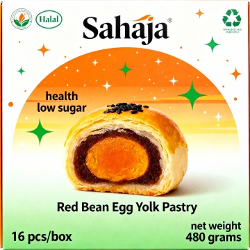 扁平风卡通包装,拟人蛋黄角色萌趣互动,双色设计突出低糖健康理念,印刷风文字强化促销信息,整体充满可爱感与节日喜庆氛围。