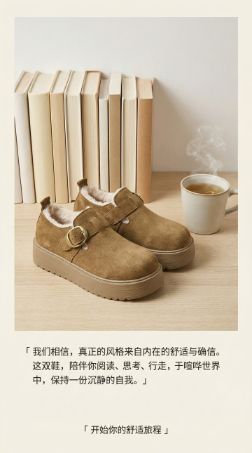 纯色背景,居中摆放鞋子,下方文案: 「一双不喧哗的鞋, 懂得沉默的价值, 也懂得陪伴的深度。 —— 献给所有在阅读与行走中寻找自由的女性」