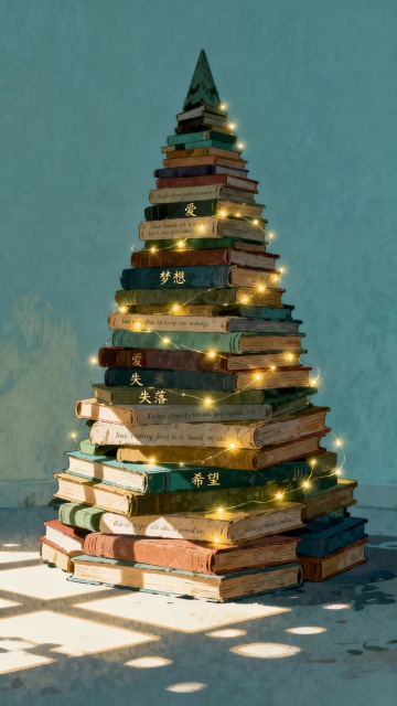 复古书本堆叠成圣诞树,暖光缠绕,3D重拟物风格,光影柔和,文艺温馨,拼贴式节日装饰,油画质感,营造舒适冬日氛围。