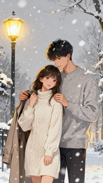 梦幻雪夜市集,动漫风插画,水彩质感光影交织,烟花绽放映衬温馨浪漫,情侣牵手前行,尽显唯美节日氛围。