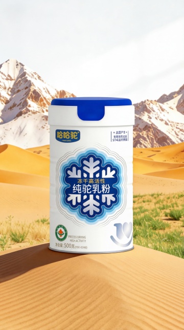 鎏金3D风,重拟物设计,金属质感罐体与沙漠场景融合,奢华呈现骆驼奶粉的高端营养守护。