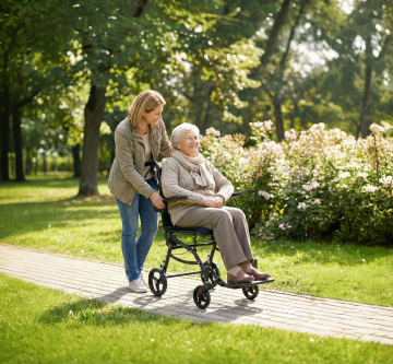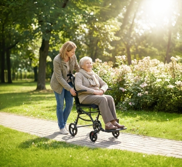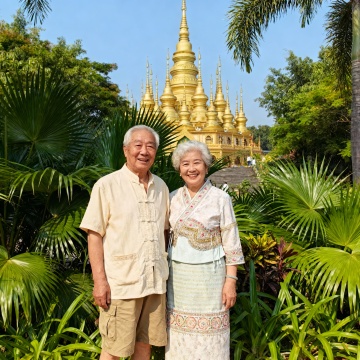 一对头发花白的老年夫妇在不同的户外场景中温馨互动的画面,背景可以是公园的林荫道、湖边的长椅、山间的小径或宁静的花园等。两位老人面带温暖灿烂的笑容,神情愉悦自然,老爷爷穿着浅灰色的长袖针织衫,老奶奶穿着米色的高领内搭和同色系的开衫马甲,老奶奶手中捧着一个白色的茶杯,老爷爷的手臂亲切地搭在老奶奶的肩上,两人姿态亲密和谐。画面整体采用写实风格,光线明亮柔和,以自然光为主,呈现出温暖的色调,绿色的植物背景郁郁葱葱,充满生机,营造出宁静、幸福、安逸的氛围,整体构图清晰,主体突出,细节丰富,具有生活气息和情感温度。