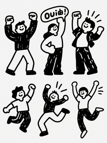 黑白涂鸦风插画,橡皮管风格人物跃动欢呼,单色线条勾勒卡通感,充满节日欢庆氛围。