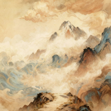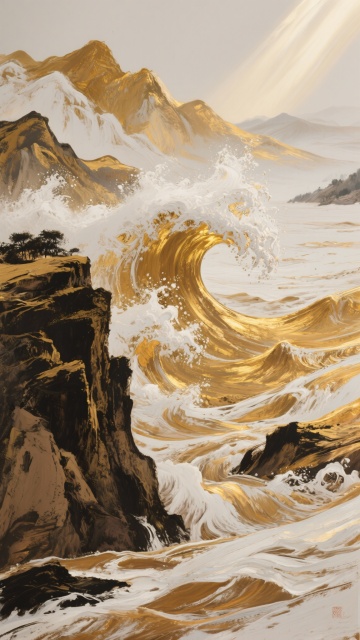 鎏金波涛卷起千堆雪,中式山水与厚涂插画交融,光影流转间尽显梦幻开阔之境,虚拟自然在油画质感中奔涌。