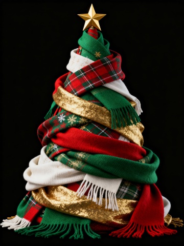以圣诞配色围巾缠绕成树,借织物的柔软质感与经典红绿金配色,融合日常物品与节日元素,打造温馨又创意的复古圣诞装饰