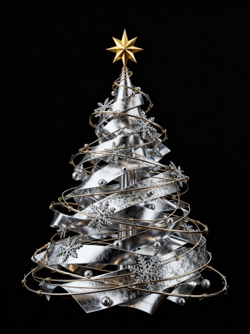 金属风3D圣诞树,鎏金星顶与螺旋金属带交织,融合未来感与奢华感,虚拟自然雪晶点缀,科技感十足的节日艺术。