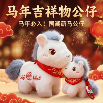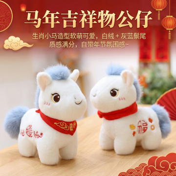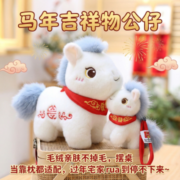6个不同配色、不同样式的卡通毛绒玩具马造型,保持与示例马一致的可爱Q版风格、圆润轮廓、缝合线细节和高光质感,每个马拥有独特的毛色与鬃尾颜色组合,浅色背景,上下两行各3个马形图案整齐对齐排列,整体构图平衡,充满童趣与温馨氛围。