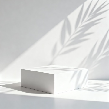 极简主义风格的白色展台场景,纯净的浅灰色背景墙,柔和的自然光从左上角斜射而下,在墙面和台面上投下清晰而富有层次感的植物叶片光影图案,叶片投影呈现出半透明的渐变效果和细腻的轮廓边缘,光影交错形成自然的韵律感,整体画面营造出宁静、优雅、简洁的氛围,光线明亮柔和,阴影过渡自然,具有高品质的3D渲染质感,画面下方是光滑平整的白色展台平面,展台边缘与背景墙自然衔接,整个构图简约大气,留白充足,视觉焦点集中在光影与展台的结合部。