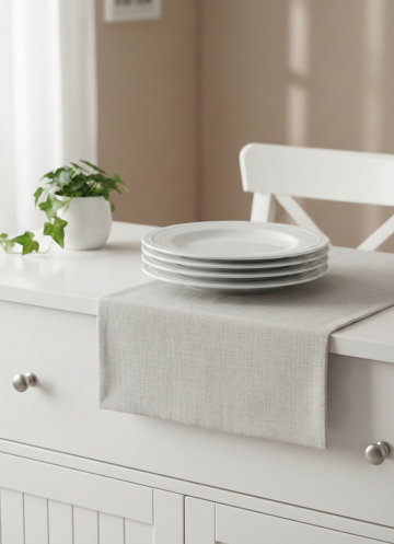 原木色桌面搭配浅色墙面的室内场景,柔和的自然光从左侧洒入形成斑驳光影,右侧白色开放式书架上摆放不同造型的陶瓷花瓶与装饰摆件,桌面上换为盛放绿色植物的白色花盆和叠放的浅色布艺餐垫,整体采用米色、浅灰与原木色调营造温馨简约的居家氛围,焦点清晰、背景虚化,呈现干净通透的生活美学感。