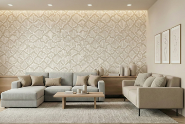 极简风装修室内场景,浅灰色布艺沙发配米白色靠垫,原木色细腿小茶几上放着插有干花的透明玻璃瓶,沙发前铺着米色编织地毯,浅灰色墙壁悬挂白色编织纹理吊灯,整体以浅灰、米白、原木色为主色调,光线柔和明亮,空间宽敞留白,线条简洁流畅,材质注重自然质感,营造宁静、舒适、简约的居住氛围,无任何多余装饰元素。