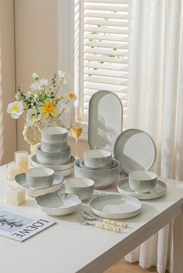 极简主义风格的餐桌背景,柔和的浅色调墙面,温暖的自然光透过窗户形成清晰的几何阴影投射在桌面上,木质餐桌表面带有细腻的木纹和自然的光影变化,左侧摆放着两个木质容器,里面整齐插着不同尺寸的木勺和金属餐具,右侧是一叠浅绿色的陶瓷盘子和一小盆新鲜的绿色植物,整体氛围宁静、温馨、充满生活气息,具有高度的3D质感和真实的材质表现,构图简洁平衡,视觉焦点明确。