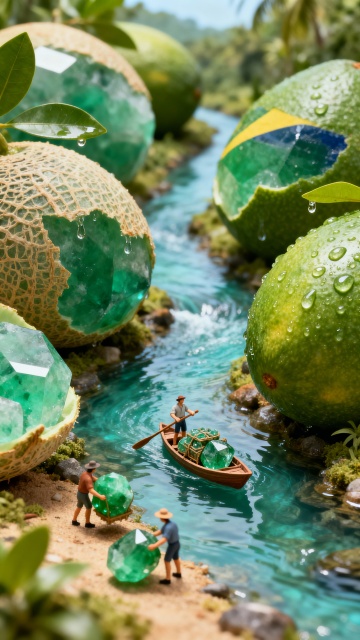 巴西风情,一条清澈的河,河岸是巨大的香蕉,有没剥皮还带叶子的香蕉,有剥了一半皮的香蕉,剥皮的香蕉表面有冷凝水珠,河里有几个人在划船运香蕉,岸上有几个人在把岸上的小香蕉搬运给船上的人