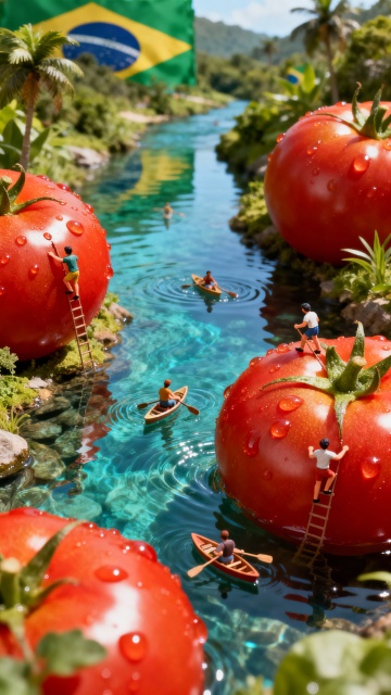 梦幻感与清新感交织的微缩艺术风场景,巨型番茄环绕清澈溪流,人物在番茄上攀爬、划船,融合3D风与超现实主义,展现虚拟自然的趣味奇境。