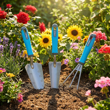 比例1:1产品场景图,画面背景是阳光明媚的花园,画面中人物手穿图2手套,拿着左边的三爪耙正在为鲜花刨根,其余两部自然摆放在,突显产品,不用出现人物面容