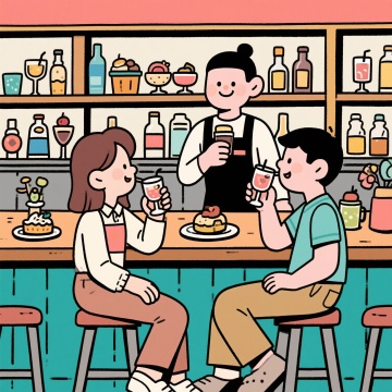 卡通插画风,三个孩子开心分享零食,色彩明亮,充满可爱与童趣。