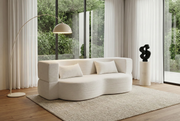 极简主义风格室内场景,浅米色布艺弧形沙发,搭配几个同色系靠垫和一个橙色花纹抱枕,沙发下方是浅灰色编织地毯,前方有一张黑色细腿圆形小茶几,上面放着几本书和一个装饰品,背景墙挂着一幅线条简约的抽象画,左侧有一扇窗户,挂着浅色半透明窗帘,窗边有一个黑色金属框架的边几,右侧有一盆大型绿植,天花板悬挂着一盏黑色金属吊灯,整体色调以米白色、浅灰色为主,光线柔和明亮,营造出宁静、舒适、简约而不失格调的氛围。