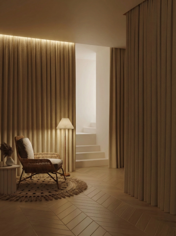 3D渲染风格室内场景,整体采用极简主义设计,主色调为纯净的米白色与柔和的浅米色,搭配低饱和度的绿色地毯和橄榄绿、暖橙色靠垫形成和谐的色彩层次。明亮的自然光从拱形窗户洒入,在墙面和地面形成清晰的光影交错效果,营造出温暖、宁静而通透的氛围。画面中包含一个米白色的模块化沙发,沙发上放置着不同颜色和材质的靠垫,沙发旁有一盆绿色植物增添生机。墙面设计简洁,一侧有垂直条纹装饰元素,地面铺设浅色木地板,整体构图遵循对称美学与三分法原则,空间感开阔,细节质感细腻,光线柔和自然,呈现出舒适、简约而富有设计感的居住环境。