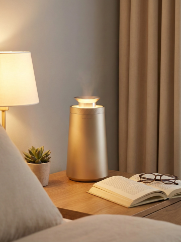 暖光轻雾萦绕,木雕风床头柜上简约加湿器静置,柔光透帘,营造冬日温馨实景感,轻拟物设计呼应自然舒适。