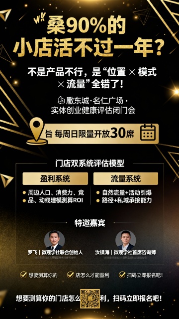 标题:🔥 90%的小店活不过一年? 副标题:不是产品不行,是“位置 × 模式 × 流量”全错了! 📍东城·名仁广场 · 实体创业健康评估闭门会 ⏰ 每周日限量开放30席 “门店双系统评估模型”:  🔹 盈利系统:基于周边人口、消费力、竞品、动线建模测算ROI  🔹 流量系统:预测自然流量+活动引爆路径+私域承接能力 👨‍🏫 特邀嘉宾: 罗飞|微观学社联合创始人 “传统门店盈利守护者” —— 经手项目100%实现盈利 汝镇海|微观学社首席咨询师 “三天引爆客流之神” —— 56家门店见证“从冷清到排队” ✅ 我们不做招商宣讲 ✅ 我们不卖课程、不推加盟 ✅ 我们只做一件事: 用系统告诉你——这家店,在这里,能不能赚钱? 想要测算你的门店怎么才能盈利,扫码立即报名吧! 生成黑金色高档商务招商海报,竖版,要求文案完整