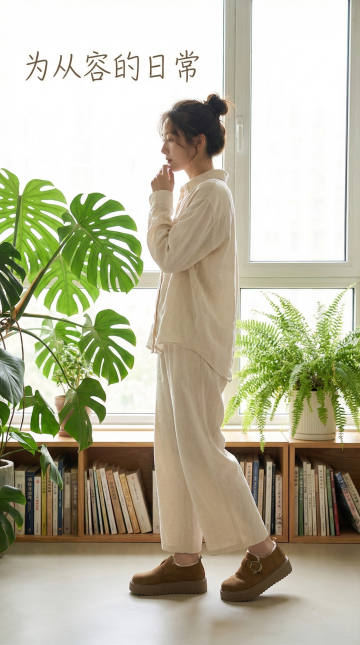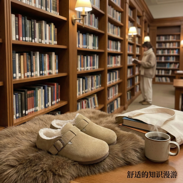女模特(不露脸或侧脸)身着燕麦色高领毛衣、卡其色阔腿裤,坐在家中书架前,双脚自然交叠,勃肯鞋出镜。场景延伸,展示全身穿搭。文案:“阅读、思考、创作的静谧伴侣”。