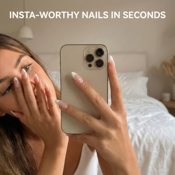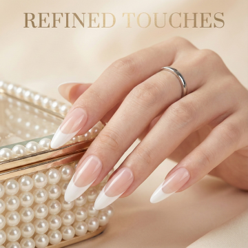 一只女性的手,手指修长,手掌自然舒展,指尖微微上翘,保持着自然放松的姿态,皮肤呈现出细腻白皙的质感,带有健康的光泽,白色背景干净简洁,突出手部主体,指甲变换为带有精致法式白色微笑线的美甲样式,指甲边缘线条流畅清晰,甲面光滑平整,整体呈现出优雅、简约又不失精致的美感,光影效果自然柔和,高光和阴影过渡细腻,展现出手部的立体感和真实质感。
