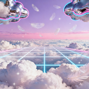 赛博朋克风与蒸汽波美学交融,霓虹网格悬浮于云海之上,金属云朵镶嵌荧光线条,羽毛轻舞,光影交织,营造梦幻浪漫的未来虚拟现实场景。