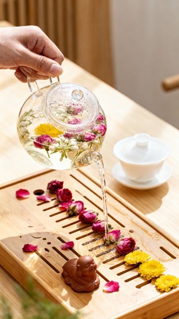 A photorealistic close-up, top-down view of a Chinese tea setting. On a solid wooden tea tray, a clear glass teapot and cup sit stably. Inside the teapot, only dried rose buds, dried jasmine flower petals (素馨花), and dried pink silk tree blossom fragments (合欢花) are steeping in hot water, showing a light golden-amber tea color. On the tray around the set, a few extra dried petals and buds of all three flowers are scattered naturally. Soft afternoon light, clean background, shallow depth of field, conveying a serene, authentic, and drinkable feeling. All objects are resting firmly. –ar 9:16 –style raw –no stems, long stems, branches, fresh flowers, clear water, floating objects, weird perspective