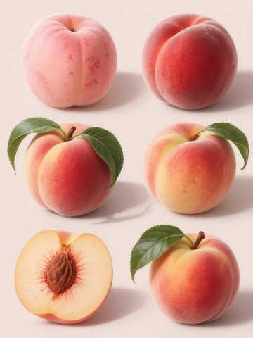 六个不同样式的桃子造型,上下两行各三个对齐排列,浅色背景。每个桃子均采用超写实主义风格绘制,具有高度细腻的细节和逼真的质感,展现出桃子特有的绒毛感和光滑果皮。桃子颜色从底部的淡黄色渐变到顶部的粉红色和深红色,带有自然的红晕和斑点。部分桃子带有翠绿的叶子,叶子有清晰的叶脉和自然的弯曲形态。其中一个桃子被切开,露出内部橙黄色的果肉和棕色的果核,果肉纹理清晰可见,果核周围有红色的放射状纹路。整体光影效果柔和,高光和阴影过渡自然,营造出立体感和真实的光泽。