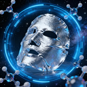 一张透明的水晶质感面膜,表面有细腻的冰裂纹理,呈现出半透明的银白色光泽。面膜的形状贴合人脸,有对称分布的眼洞、鼻洞和嘴洞,边缘光滑。面膜下方有几滴晶莹的水珠正在缓缓滴落,水珠透明且富有光泽。整个画面采用简约的构图,以纯白色为背景,突出面膜的纯净和立体感,营造出一种清冷、洁净的氛围。
