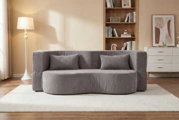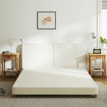 极简风格卧室室内设计,以浅米色墙面为背景,搭配原木色实木床架,铺着浅灰色亚麻质感床单,床头摆放两个浅米色方形靠枕和两个浅灰色长条形枕,床尾随意搭着一条米白色针织毯。床的左侧是原木色床头柜,上面放置一个白色陶瓷小花瓶,插着几根干枝,旁边有一个白色小茶杯和托盘。床头柜上方墙面挂着一幅极简风格装饰画,画框为原木色,画面是三束黑色线条勾勒的麦穗图案。床的右侧是一盏白色金属落地灯,灯罩为米白色布艺材质。床前浅色木地板上铺设一块米白色长方形棉麻地毯,地毯上放着一个圆形编织篮,篮子里有一本翻开的书。整体色调以米色、浅灰、原木色为主,光线柔和,营造出宁静、舒适、简洁的氛围,空间布局对称平衡,线条干净利落,无多余装饰,体现极致的简约美学。