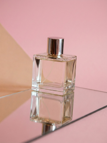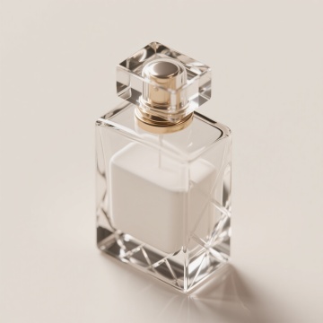 一瓶高级的香水,玻璃瓶子内装有白色液体,