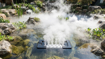 将这个雾化器放置在置景水池中水刚好淹没雾化器 水面飘着淡淡的烟雾 广角 生成2张