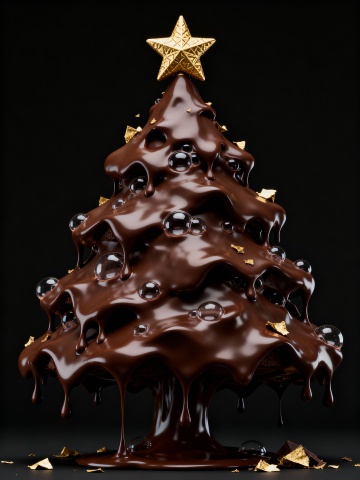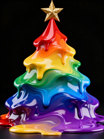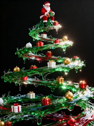 液态圣诞树,3D重拟物风格,融合粒子飞溅与梦幻色彩,喜庆酷炫,虚拟自然元素交织,节日氛围爆棚。