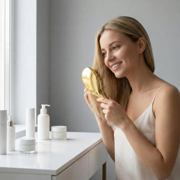 极简高端美妆产品集合海报,六个完全不同的美妆元素规整排布于纯白色纯色背景上,保持高清写实摄影风格,光线明亮柔和,物体表面有细腻高光与轻微阴影,展现透明玻璃与精致塑料的质感。元素包括:左上角为方形透明玻璃面霜瓶配银色金属盖,标签简约;右上角是圆柱形白色乳液瓶带按压泵头;中间左侧为长方体磨砂玻璃精华液瓶;中间右侧是黑色皮质化妆包带金色拉链;左下角为三支不同尺寸的化妆刷套装,刷毛柔软呈浅棕色;右下角为圆形透明唇釉管体。所有物体间距均匀,构图对称平衡,整体传达优雅、高端、专业的美妆产品氛围,无任何文字、LOGO、二维码及多余信息。