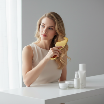 超写实3D渲染风格,纯白纯色背景,高光泽金属质感与细腻膏体纹理,光影效果为顶部斜射柔光形成明显高光与渐变阴影,六个化妆品元素规整排布组成系列集合:金色瓶盖黑色瓶身的香水、透明菱形切割面的粉底液瓶、带金色装饰的黑色睫毛膏管、玫瑰金色外壳的腮红刷、方形黑色眼影盘配金色边框、圆柱形高光修容棒,每个元素均保持与原图一致的高反光材质、精致细节刻画和45度角倾斜摆放,整体构图对称平衡,色彩以黑金色为主色调搭配产品本身色彩点缀,营造高端奢华的化妆品系列视觉效果。