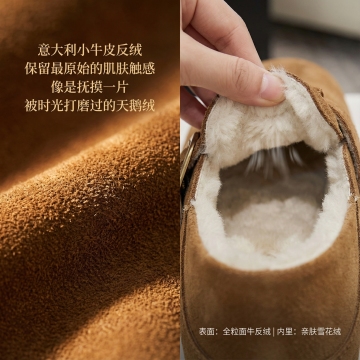 特写牛反绒的细腻缝线、皮质包边,以及雪花绒内里与鞋帮的工整贴合工艺。 文案修改为: “甄选原生皮绒与丰盈内里,于细节处彰显本真”。