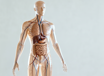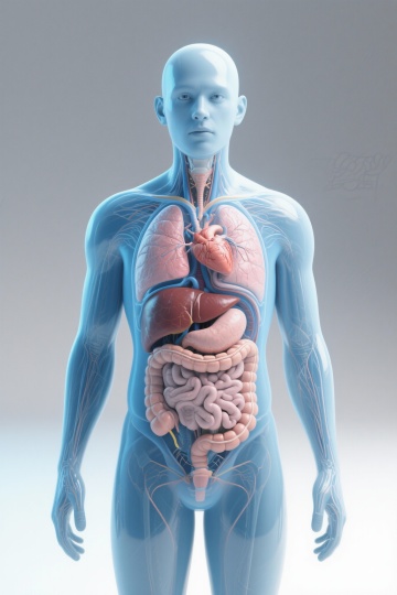 视觉焦点: 一个被金色光束照亮的、透明的腹部剖面,内部是复杂的肠道景观。