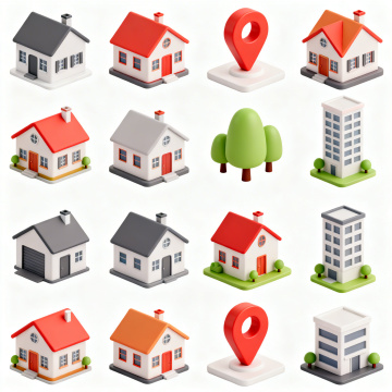 3D卡通风格建筑系列图标,保持简约低多边形设计,圆角处理,柔和阴影,纯色背景,每个建筑拥有独特鲜明的整体色调(如红色系、黄色系、绿色系、紫色系、橙色系、深蓝色系),包含6个不同类型的建筑物(如医院、学校、商店、消防站、警察局、图书馆),每个建筑保留同类目特征元素,所有建筑图标等大规整排列,形成视觉统一的系列素材集合。