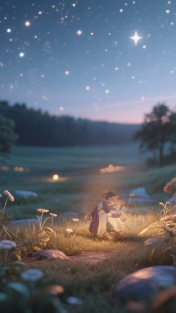 梦幻插画风,3D角色在超现实宇宙中浪漫相会,紫色调营造唯美感与节日氛围。